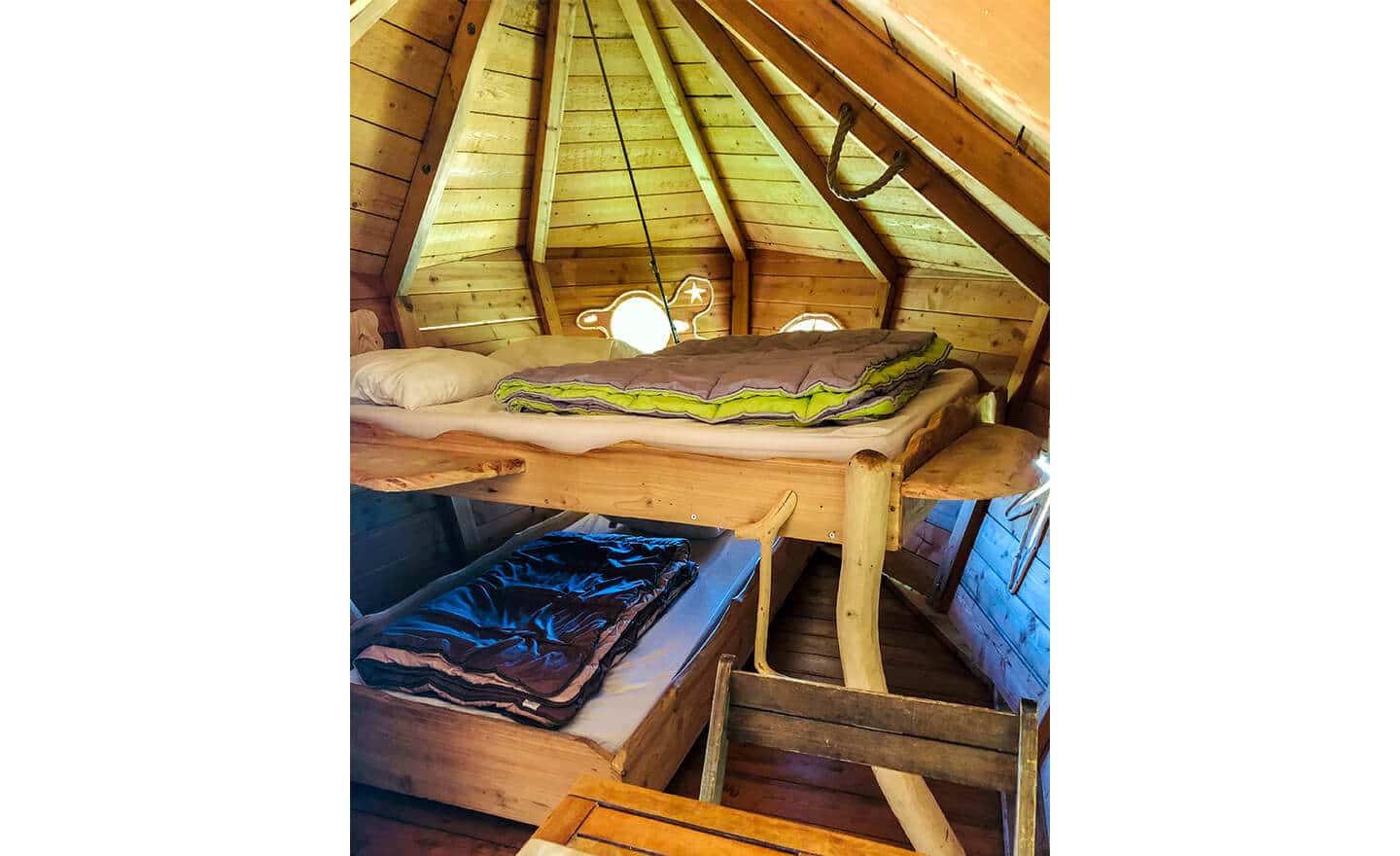 Your adventure begins with a short hike, backpack and appropriate footwear, after collecting your map and keys. Live out your childhood dream and sleep in a perched cabin. Ideal for the more adventurous who want to retreat to the depths of the estate, where everything is calm, gentle and tranquil. Arriving in front of the hundred-year-old oak tree that supports your cozy nest, you’ll now have to climb the 7m to reach the top. A short staircase, then a vertiginous miller’s ladder, and you’re there!