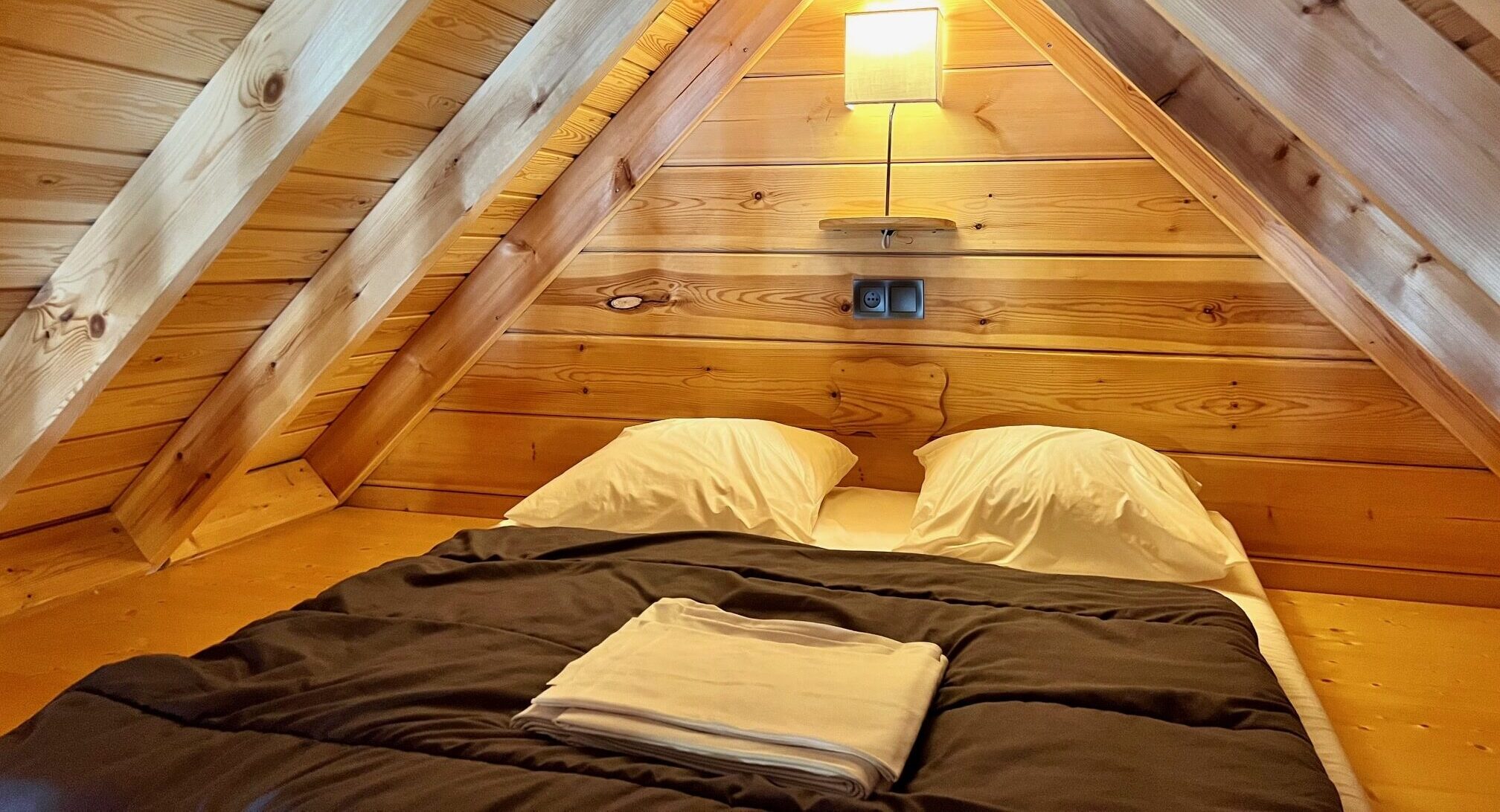 The layout is organized around 4 beds with 2 double beds, 1 of which is on a mezzanine accessible by a ladder, a spacious and convivial common area, and a small kitchenette with electric hob and crockery. The sumptuous bathroom and separate toilet.