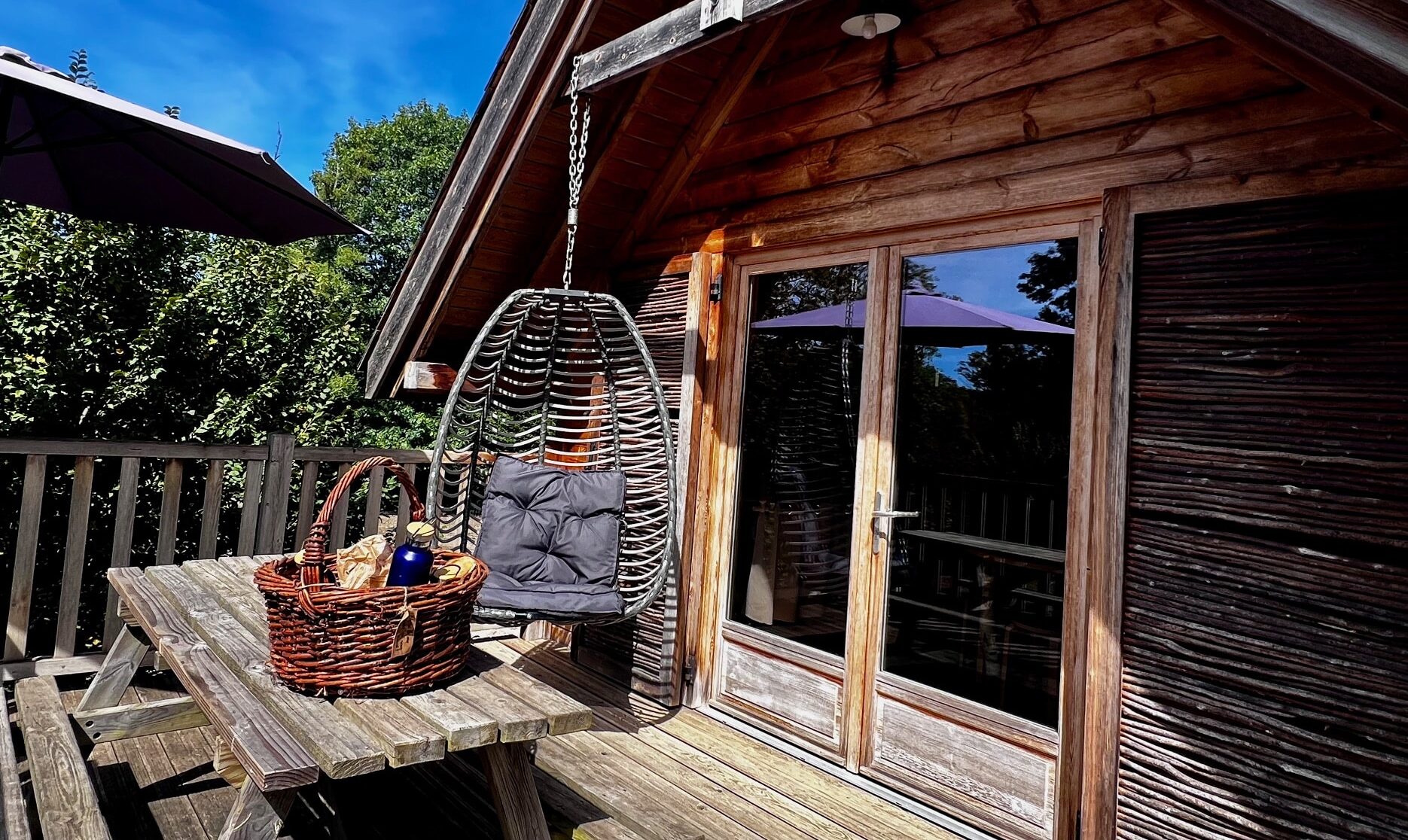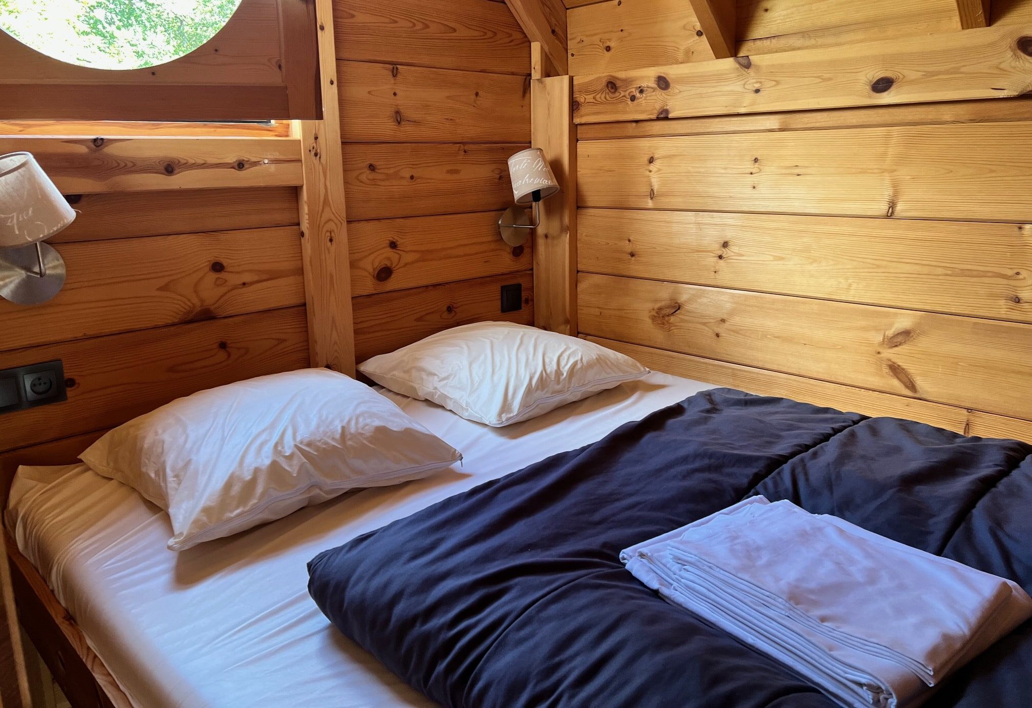 Solidly built and massive, all the originality of this perched cabin is revealed when you open its pretty louvered doors… You’ll be seduced by its warm decor, its wooden bathtub, in which you can already see yourself, invites you to relax, and the view from its terrace over the Parc des Cerfs et des Daims will delight you.