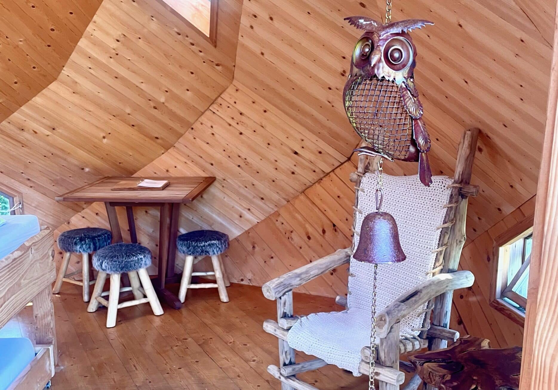 Le Cocon perché des hiboux, for 2 or 3 people, is a comfort lodge equipped with electricity and dry toilets (under the cabin). It’s a 5-minute walk to the individual bathrooms in the animal area.
