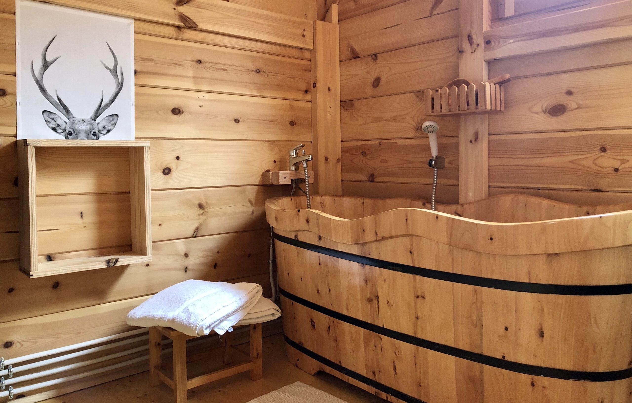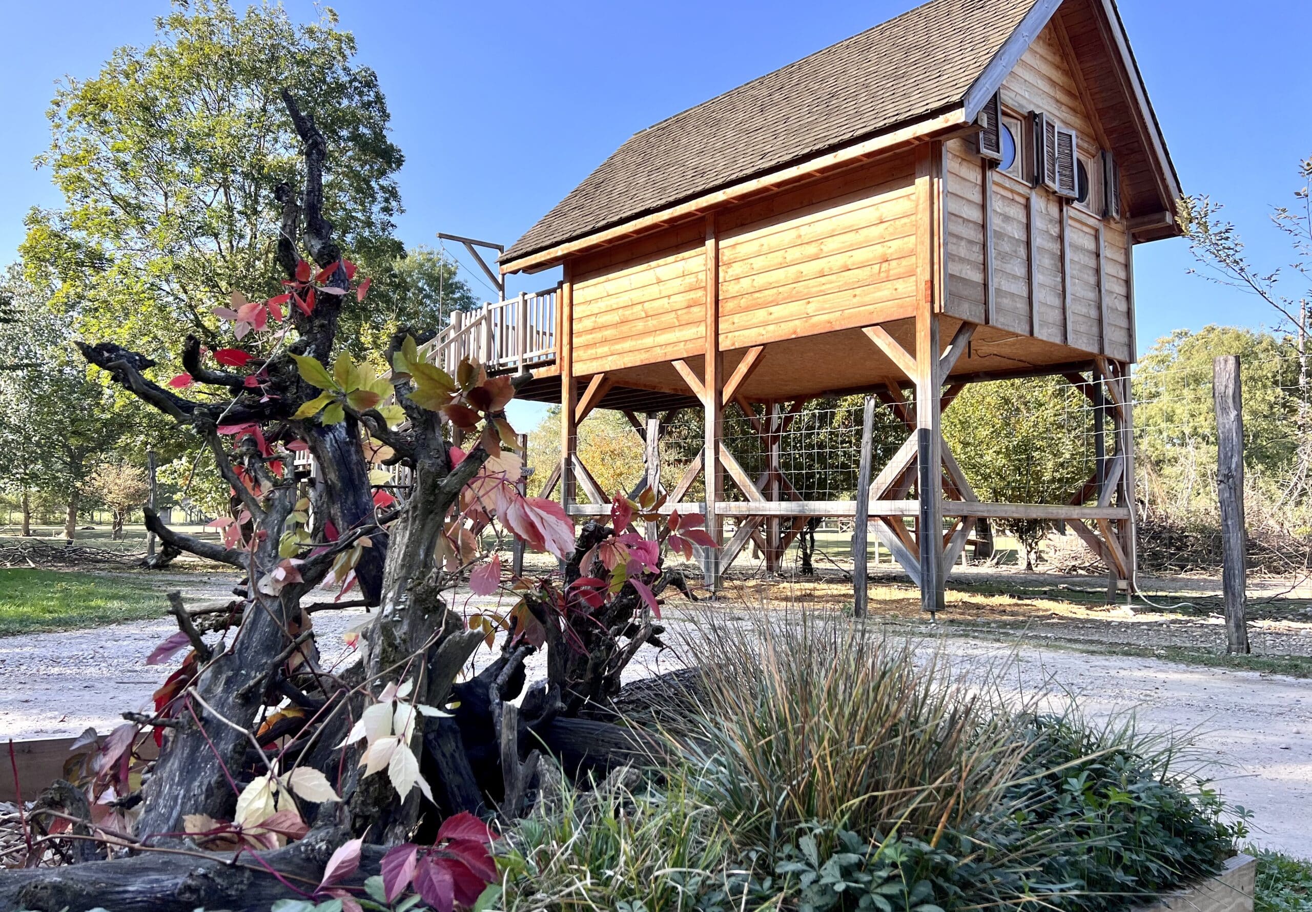 Structure solide et massive, toute l’originalité de cette cabane perchée se découvre à l’ouverture de ses jolies portes persiennes… Sa décoration chaleureuse vous séduira, sa baignoire en bois dans laquelle on se voit déjà invite directement à la détente et la vue depuis sa terrasse sur le parc des Cerfs et des Daims vous ravira.