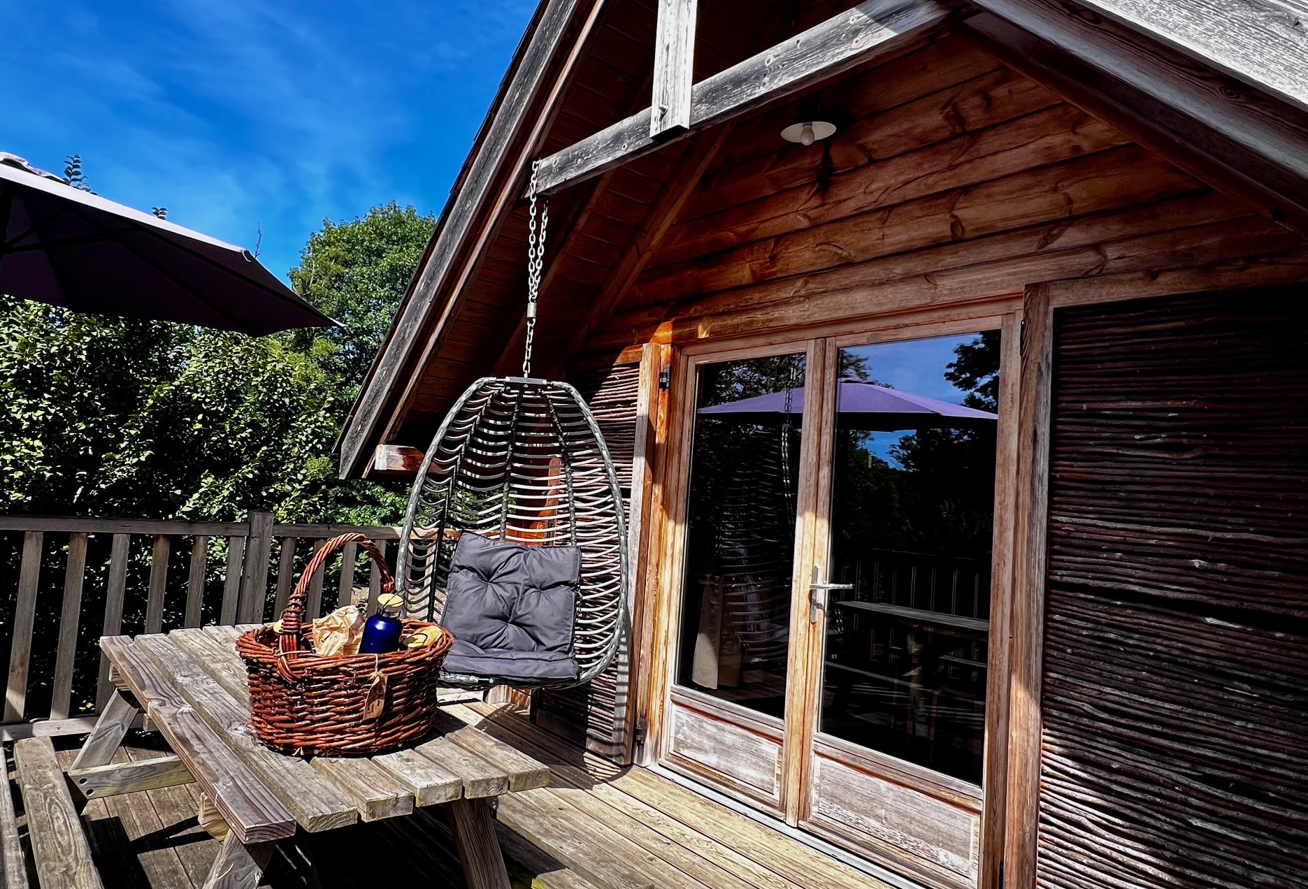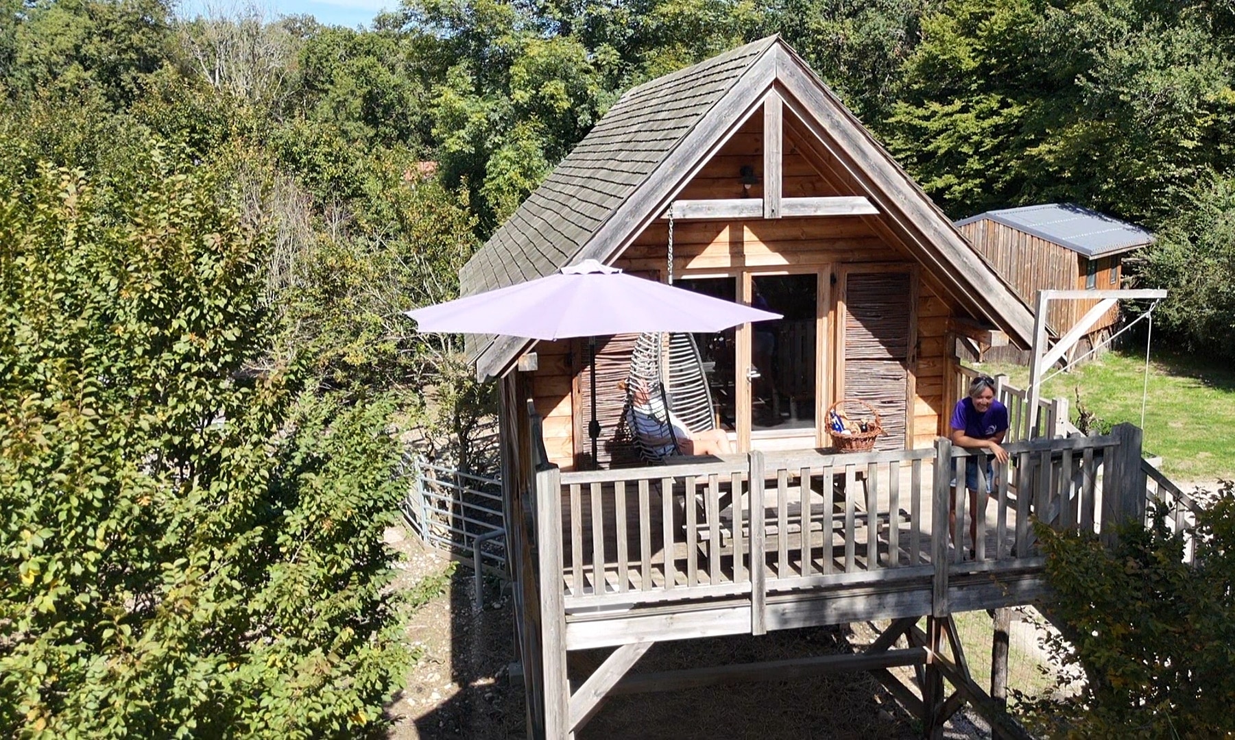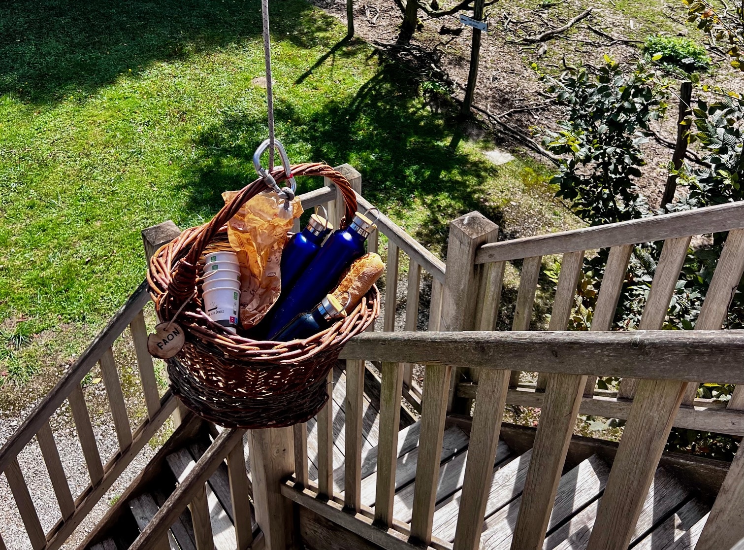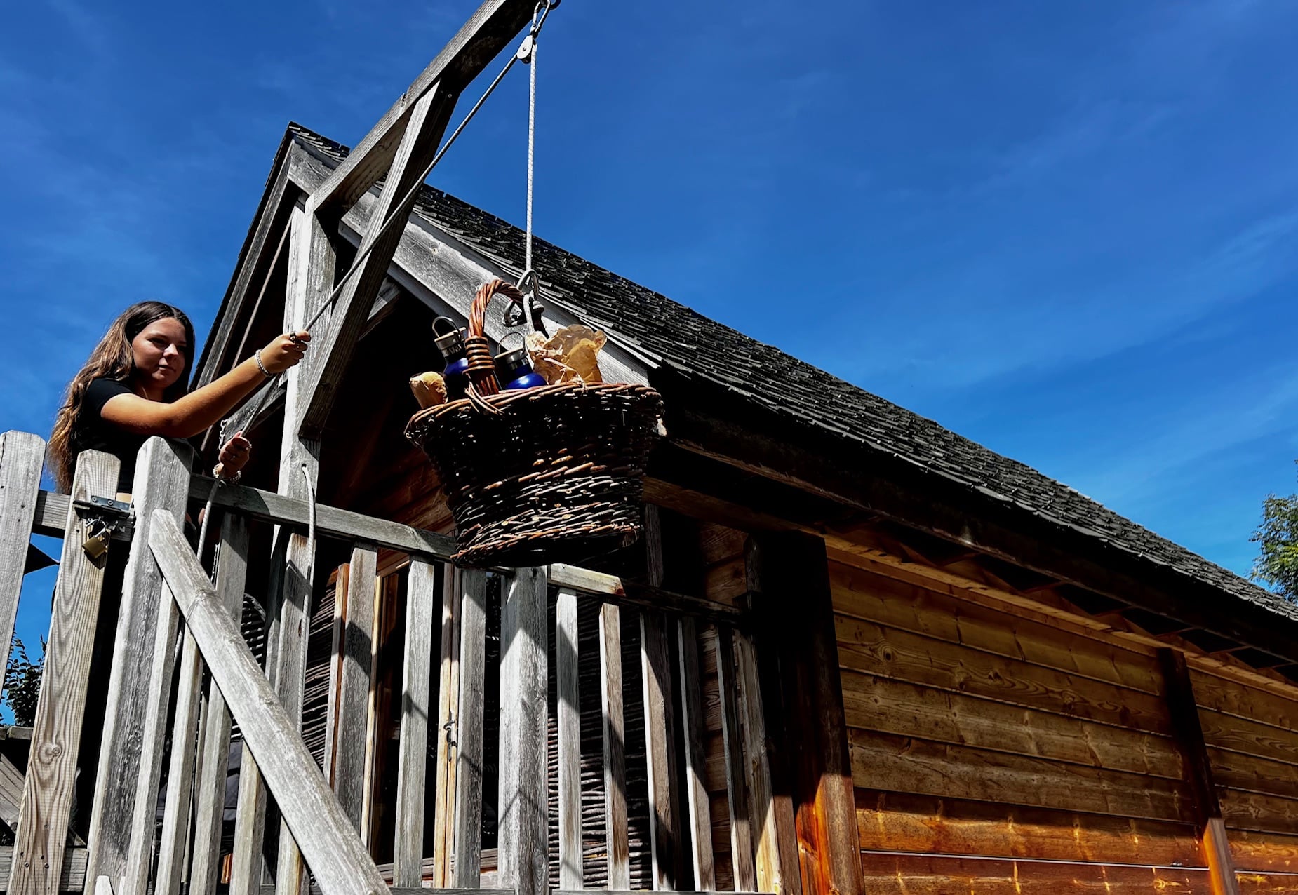 Cabane perchée des faons très bien équipée et agencée, service repas et petit déjeuner servis dans des paniers très ludiques pour les enfants qui sont contents de hisser les mets en haut