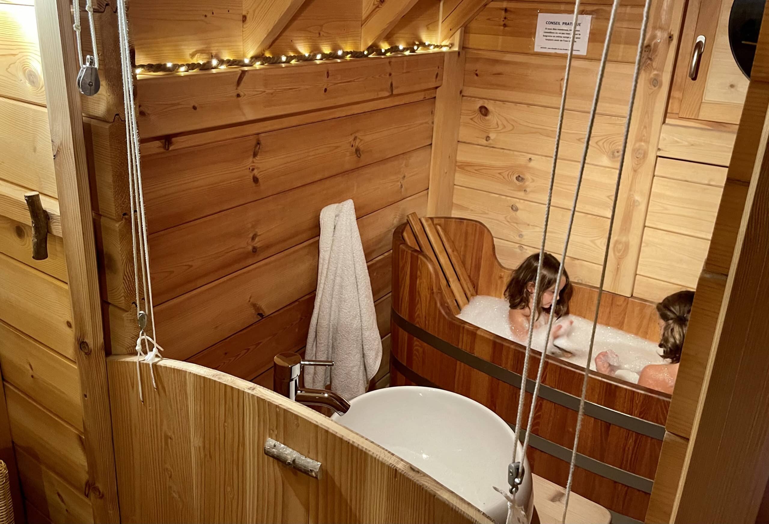 L’originalité vous l’aurez en passant la nuit au dessus des sangliers, laies et petits marcassins; animaux que vous pourrez observer depuis la terrasse, allongé dans l’œuf suspendu. Les enfants adoreront aussi leur chambre dédiée, accessible par un petit tunnel secret … interdit aux parents ( trop grands ). Et ce n’est pas tout, la baignoire en bois charmera assurément petits et grands