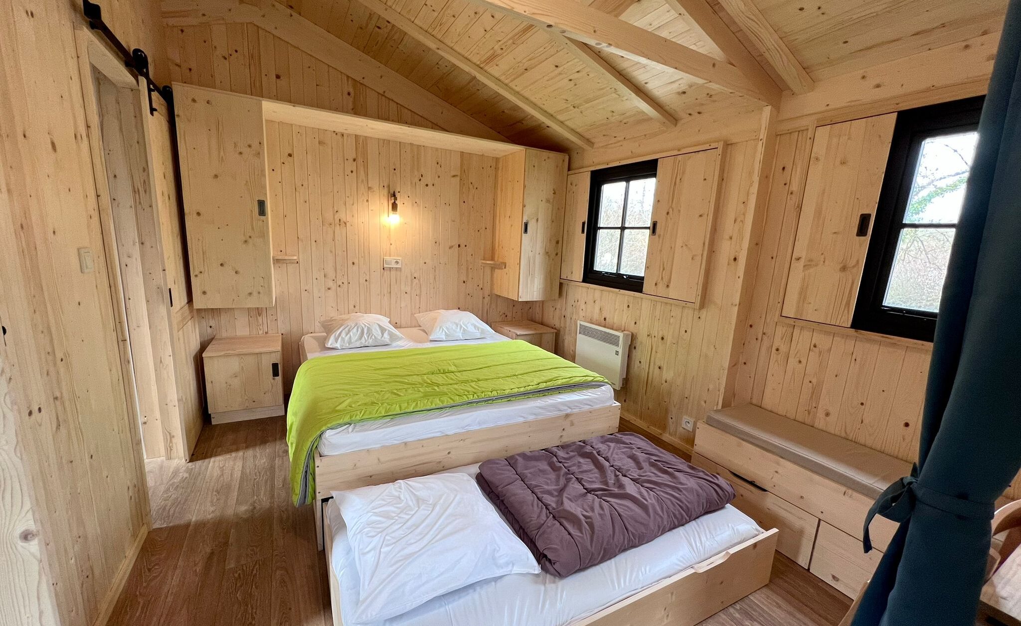 Type de lits : 1 lit double + 1 lit tiroir pour un enfant de 10 ans max OU possibilité de mettre un lit parapluie pour 3e personne (en option)