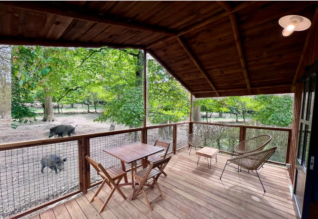 Idéalement située, à seulement 2min du parking de la zone animalière, vous découvrirez rapidement votre lodge insolite ainsi que les animaux qui passeront la nuit avec vous. Sangliers laies et marcassins déambuleront juste sous vos yeux dans l’immense parc devant votre terrasse. Splendide, aménagée avec table et chaises ainsi que des transats, qui vous invitent à la détente absolue.